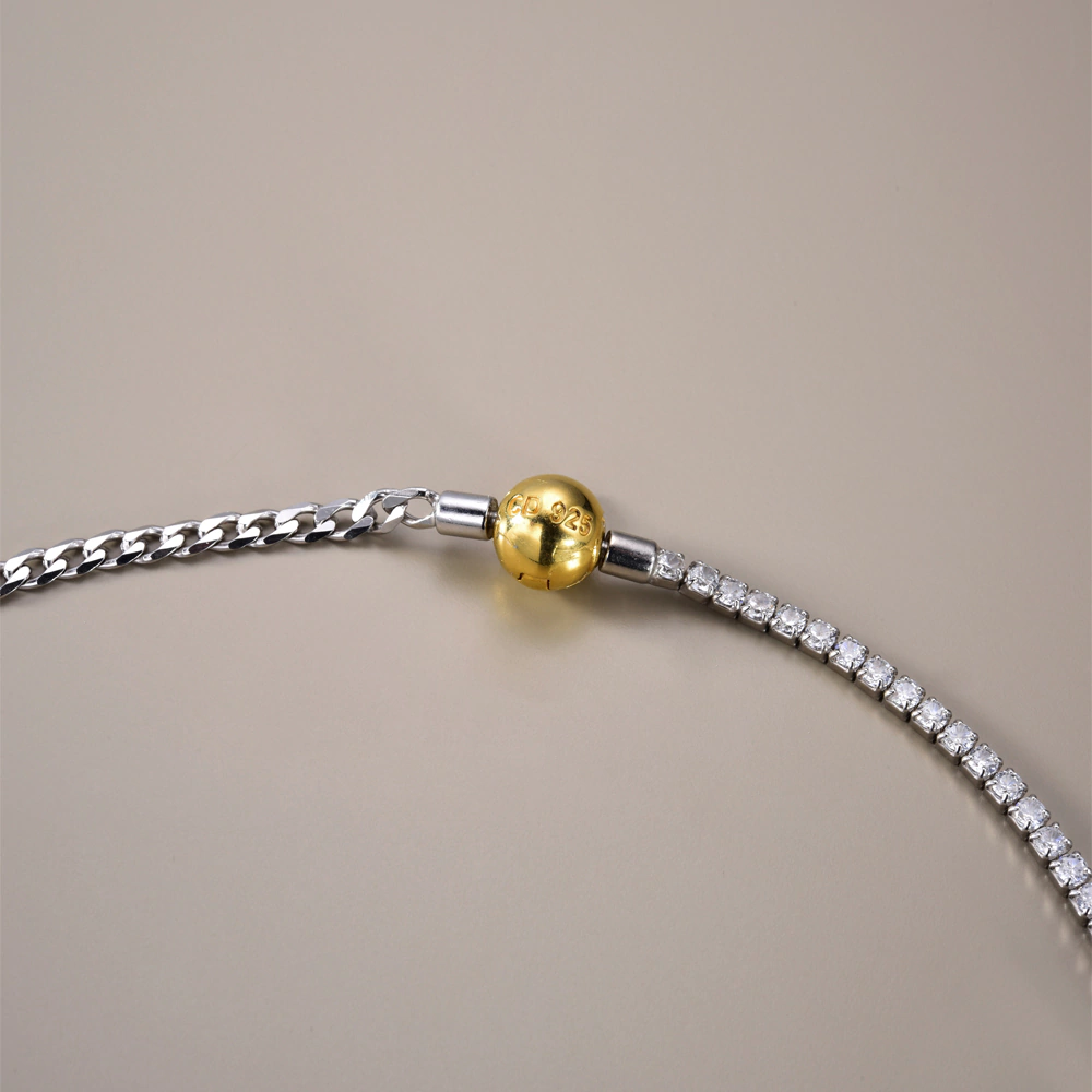 Colar de prata assimétrico com mix de corrente Riviera e Grumet com ponto de luz na divisória. O pingente de estrela cravejado é removível e o fechamento especial com banho de ouro 18k em cima da Prata 925 pode ser usado como pingente para frente.